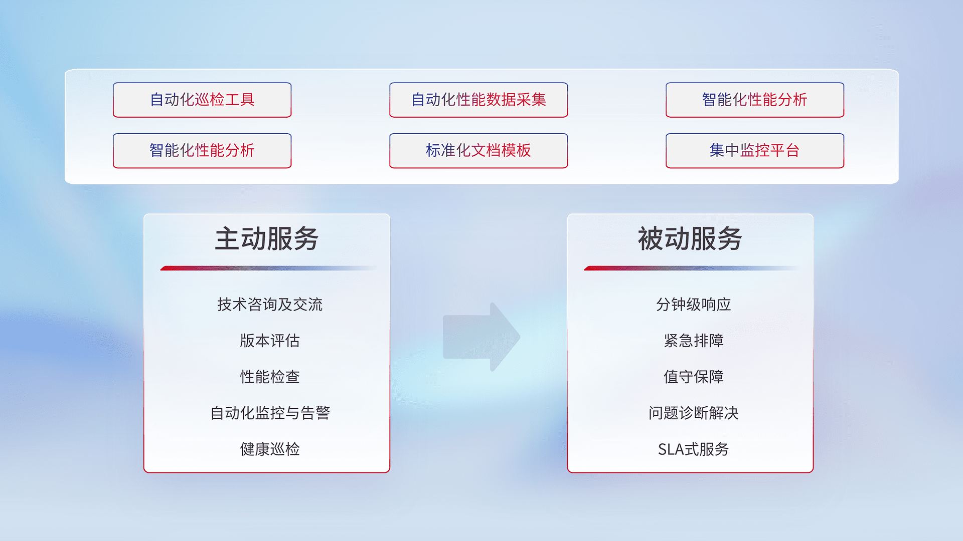 智能化工具和标准化文档,,,,保障服务质量,,,提供主动服务(包含技术咨询、、版本评估、、、、性能检查、、自动化监控与告警、、、健康巡检)和被动服务包含(分钟级响应、、、紧急排障、、、值守保障、、、问题诊断解决、、、、SLA服务)。。。