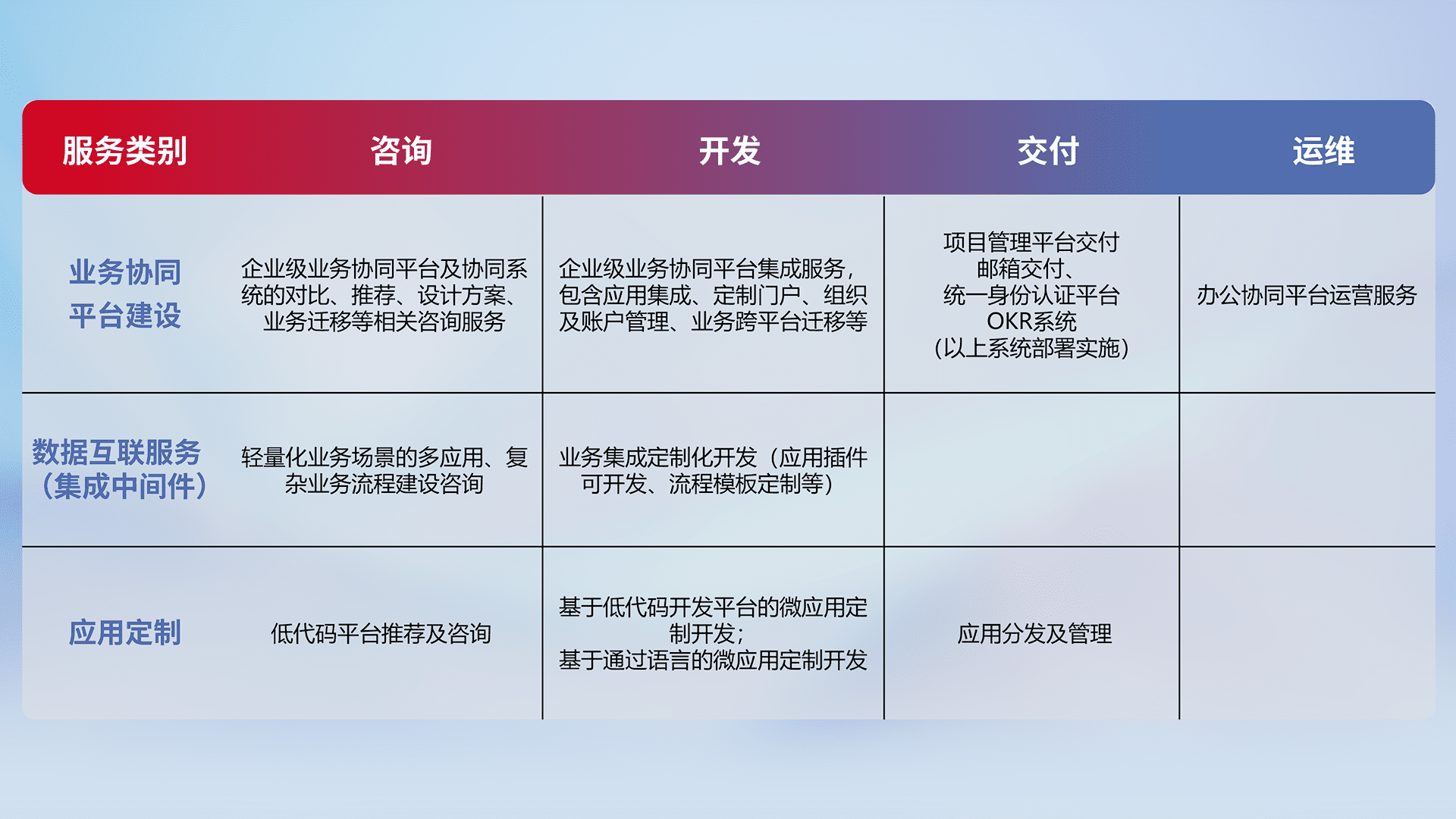 针对钉钉、、、、企微、、、IDaas等平台级产品提供产品的规划、、方案、、、、交付、、定制化开发等服务,,实现如统一协同办公、、、、智能客户服务、、、、混合会议管理、、智能数据查询、、等业务场景,,实现数字化转型。。